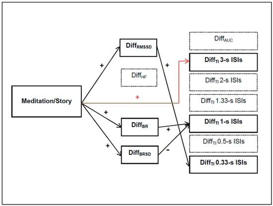 A series of mediation analyses was conducted. The path analyses were computed between groups (X = meditation vs. story), for each dependent variable separately (DiffAUC and DiffTI at: 0.33, 0.50, 0.75, 1, 2 and 3-second ISI), and using four potential intervening variables (DiffRMSSD, DiffHF, DiffBR and DiffBRSD) (see Figure 1). The analyses were conducted on the total sample (n = 84). The following reported coefficients are non-standardized.