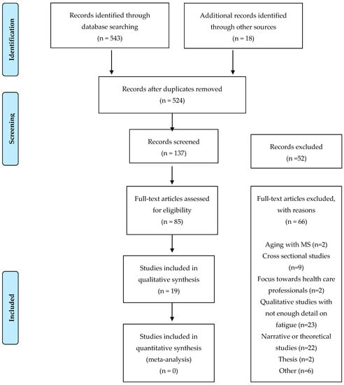 A total of 561 articles were screened of which 19 articles were included. The PRISMA diagram describing this can be seen in Figure 1. The study designs included 18 qualitative studies and one mixed method study [32,33,34,35,36,37,38,39,40,41,42,43,44,45,46,47,48,49,50]. A total of 263 individuals were included across the studies. Two hundred forty-three PwMS (159 females, 70 males and 14 unknown) were identified. In addition to this, there were five spouses of PwMS and 15 health care professionals (six physiotherapists, six occupational therapists, three MS support workers and three neurologists). Fourteen of the studies used semi-structured interviews (14/19, 74%). The remaining studies used focus groups (2/19, 11%) and both semi-structured interviews alongside focus groups (3/19, 16%).