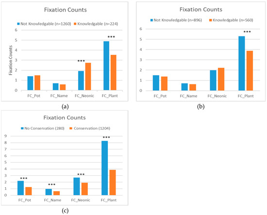 Fixation counts patterns by different groups. (a) by perceived knowledge about neonicotinoids; (b) by knowledge about pollinator attractive plants; (c) by conservation activity. Notes: *** indicates whether the mean difference between participants in different groups are statistically significant (p < 0.01) based on a pairwise t-test. In Figure 2a, respondents were defined as knowledgeable about neonicotinoids if they had heard about neonicotinoids and self-reported higher levels of knowledge about neonicotinoids (i.e., selected 4 or higher on the seven-point Likert knowledge scale). In Figure 2b, grouping of knowledgeable and not knowledgeable groups was based on participants’ answers to quiz questions. A respondent is defined as knowledgeable about pollinator attractive plants if he/she correctly answered to at least three out of the four quiz questions. In Figure 2c, grouping of pollinator conservation groups was based on participants’ self-reported actions. A respondent is defined as involved in conservation efforts if he/she is currently taking at least one action to improve pollinator health in his/her landscape, yard or garden. Such actions include (a) plant selection to feed adults, (b) plants selection to feed larvae/young, (c) decrease/do not use pesticides, (d) add features to aid pollinator insects (brush piles, water sources, etc.) (e) Source plants locally, (f) primarily buy native plants, (g) primarily buy plants that are labeled as helpful to pollinators, (h) primarily buy flowering plants.
