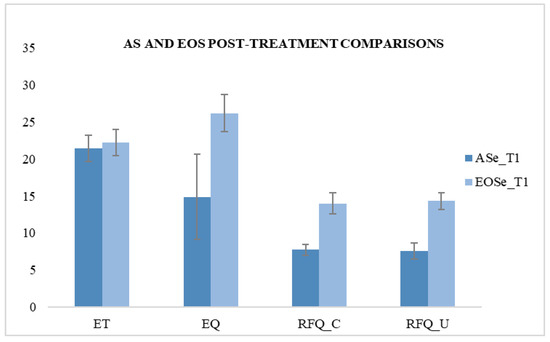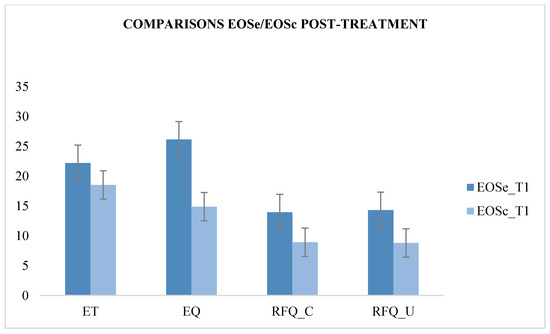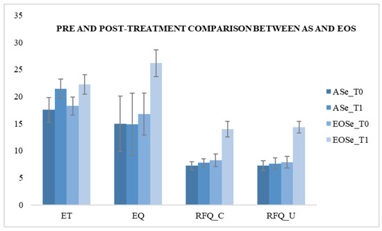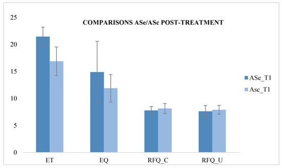We then compared the T1 scores of the ASe group and the EOSe group, and it highlighted significant differences after REBT treatment, detected in the EQ test (F (1.49) = 81.738; p < 0.05) and the RFQ test in the certainty subscale (F (1.49) = 374.90; p < 0.05) and in the uncertainty subscale (F (1.49) = 471.71; p < 0.05) (Table 5 and Figure 4).