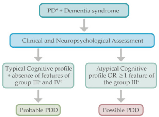 PD subjects who develop dementia do not need further complementary examinations as per the PDD diagnostic criteria [15] (see Figure 1). Like in DLB, a comprehensive neuropsychological evaluation including the assessment of specific cognitive domains (attention, memory, executive functions, language, construction, praxis, and visuospatial functions) is useful to assess the specific profile of cognitive impairment.