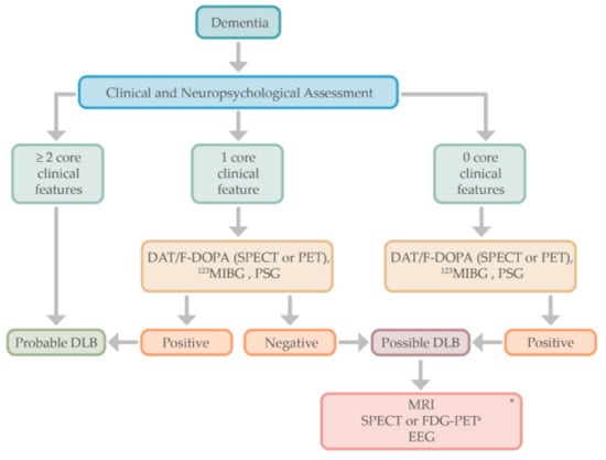 Moreover, for those patients in which dementia syndrome does not meet any of the core features of DLB, indicative biomarkers could be performed to establish the diagnosis of “possible” DLB or other neurodegenerative processes such as AD [20,21]. For those patients with atypical findings (e.g., a cognitive profile affecting memory rather than executive or visuospatial dysfunction), or for those patients with dementia in which only one of the core features of DLB is present, the use of functional imaging (e.g., DAT scans) or other indicative biomarkers may help in the diagnosis of probable DLB (see Figure 2). Supportive biomarkers such as FDG-PET, showing the typical “island sign,” or a brain MRI with relative preservation of medial temporal lobe structures, increase the certainty of a DLB diagnosis [14].