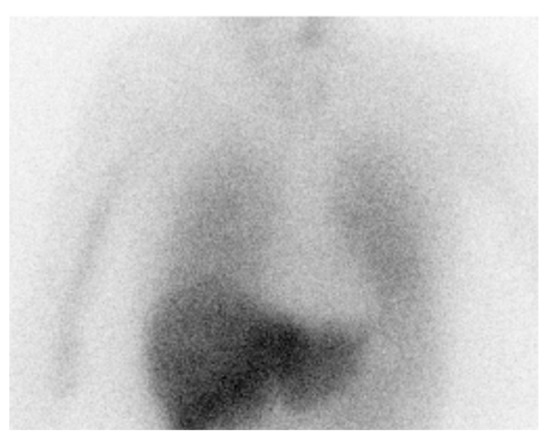 123I-MIBG myocardial scintigraphy image taken 3 h after injection. The image shows reduced uptake on 123I-MIBG in the heart, indicative of dysfunction in the postganglionic sympathetic cardiac innervation.