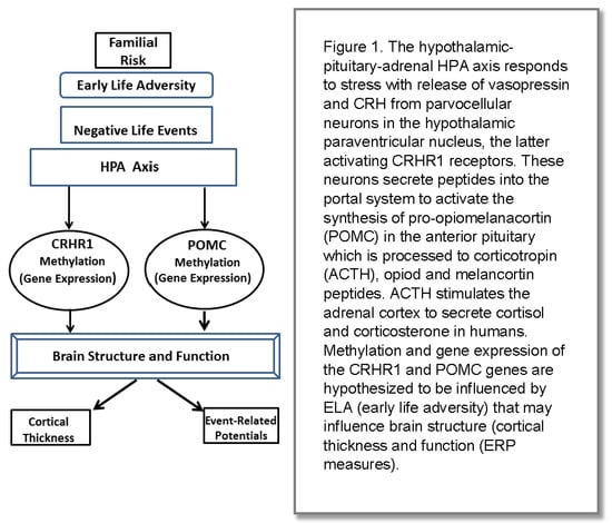 Longitudinal follow-up of offspring at ultra-high risk for AUD or SUD through their membership in multiplex families has revealed an increase in both externalizing and internalizing disorders in comparison to low-risk controls {66]. These observations along with greater negative life events being reported by these high-risk children in comparison to controls confirm that early life adversity is more prominent in offspring from families in which multiple cases of alcohol use disorders are present in the parental generation. These experiences can be expected to profoundly affect the HPA stress response. Previous observations that childhood adversity is associated with brain morphological changes [,,,,,] are consistent with the present findings showing reduced cortical thickness in two regions, LH lateral orbitofrontal and RH parsopercularis. The present observations concerning CRHR1 methylation changes suggest a possible mechanism whereby chronic stress may lead to changes in methylation and gene expression that in turn affect cortical development. Although the results for POMC were not significant overall, the findings for males suggest that an additional gene involved in the HPA axis stress response may influence brain morphology. Finally, it is useful to reflect on electrophysiological differences that may be observed between high and low risk for AUD offspring from the perspective of early childhood adversity. While there have been multiple reports showing a relationship between specific genetic variants and the commonly studied P300 component of the ERP wave, epigenetic mechanisms, particularly those involving the HPA axis may explain some of the variation seen between risk groups.