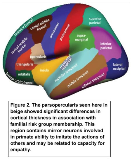In the present study, we found multiple significant correlations between P3 amplitude at Pz and cortical thickness with six of these differing by familial risk group. With the goal of determining how familial risk for AUD might change the relationship between ERP components and cortical thickness, we focused our analyses on those significant correlations that reached a p value of 0.01 or greater and showed patterns that differed in high and low-risk offspring. Interestingly, several significant correlations were seen in one familial risk group and not the other using ERP measures assessed at a point near the time of the scan. Using the most salient predictors from this analysis, Cox regression analyses were performed using SUD outcome as a measure of the strength of these predictors in influencing the development of SUD. Most of the ERP measures showing significance were those collected closest to the scan, though P300 latency recorded at the first ERP evaluation at a mean age of 11 years was a significant predictor. Cortical thickness of the parsopercularis in the right hemisphere was influential in the SUD outcome. Although the p value was marginal (0.096), the Exp (B) of 0.280 suggests that a substantial amount of variance was explained by parsopercularis (BA44) thickness. This finding is especially intriguing in view of the characteristics previously assigned to this region. The paropercularis has previously been identified as an area with mirror neurons (80), neurons thought to enable primates to imitate the actions of others and in motor learning of new skills []. Mirror neurons have also been discussed in the context of providing empathy for others []. One function of the parsopercularis may be to provide the substrate for motor-inhibitory performance in childhood and adolescence []. A comparison of cortical thickness of the parsopercularis in high- and low-risk participants found the high-risk participants have thinner cortices.