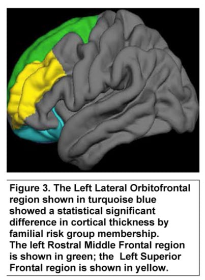 Cortical thickness of the Lh lateral orbitofrontal region also emerged as a region predicting SUD outcome. This region has been characterized as having a substantial role in anticipating choices and integrating prior with current information [,]. The cortical thickness of the Lh lateral orbitofrontal region was significantly thinner in high-risk individuals than in their low-risk counterparts.