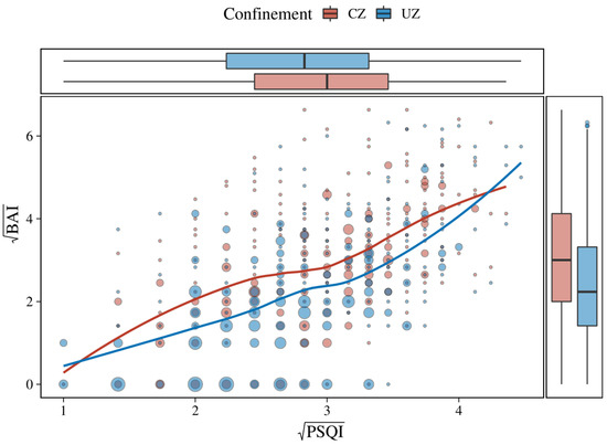 The impact of confinement on the transformed dependent variables (BAI and PSQI scores) is shown in Table 2. The bivariate distribution and the quantitative nature of the transformed variables according to confinement zone (CZ and PZ) are displayed in Figure 1.