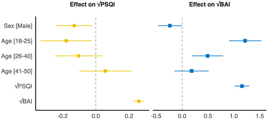 To evaluate the internal consistency of the PSQI and BAI in our data, we used the standardized Cronbach’s alpha ( α ), calculating its 95% confidence interval (CI) via nonparametric bootstrap resampling with 10,000 replicates using the R package ltm [37]. The BAI demonstrated excellent internal consistency ( α = 0.931, 95% CI [0.92, 0.94]), and the PSQI demonstrated good internal consistency ( α = 0.801, 95% CI [0.78, 0.82]).