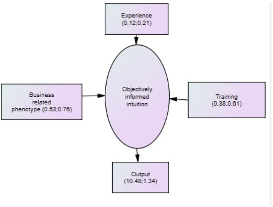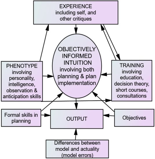 These factors mean the development of business related phenotype (BRP) is a complex and dynamic system. Furthermore, BRP impacts, for example, on the effectiveness of education and training as well as on how experience provides lessons and knowledge []. These relationships emphasize how these three factors will jointly influence ‘objectively informed intuition’.