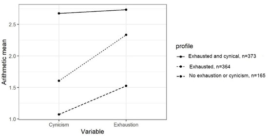 The group means for the indicator variables for the latent profiles are shown in Figure 1. The profiles were named Exhausted and cynical, Exhausted, and No exhaustion or cynicism. Students belonging to the Exhausted and cynical profile showed both high levels of exhaustion and high levels of cynicism; this profile comprised 41.5% of the students, n = 373. Compared to other profiles’ students, the Exhausted and cynical profile showed the highest levels of both burnout symptoms. Students belonging to the Exhausted profile displayed quite low levels of cynicism but elevated levels of exhaustion; this profile comprised 40.5% of the students, n = 364. Students in profile No exhaustion or cynicism comprised 18% of the sample, n = 165. This profile was characterised by low levels of exhaustion experienced and very low levels of cynicism, indicating no risk for burnout compared to other two profiles.