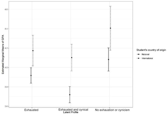 It is of interest to compare the pattern of results concerning study credits and GPAs: when it comes to the former, the interaction between the burnout profile and the student’s international status was significant, whereas when it comes to the latter, it was not. The main effect of burnout profile was still significant, reflecting the fact that students belonging to burnout profile Exhausted and cynical had the lowest GPAs, students belonging to profile No exhaustion or cynicism the highest GPAs, and students belonging to profile Exhausted something were in between the other two profiles.