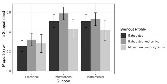 Support needs within burnout profiles. The lines indicate 95% confidence intervals that were calculated using the asymptotic method (normal approximation).