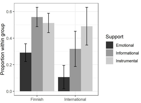 Within profile Exhausted, the individual χ2 test values in the subtables of Finnish and international students were 6.69, 8.54 and 0.09, and the Cramer’s V values 0.159, 0.184 and 0.009, respectively. This indicates that Finnish and international students belonging to that profile differed in their needs for emotional and informational support (Finnish students required more emotional and informational support than international students did), while their instrumental support needs were roughly equal. These results are illustrated below in Figure 5.