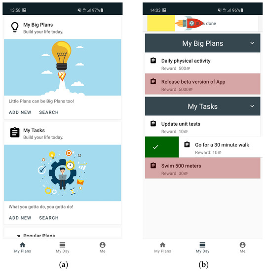 Core screens of our mobile application: (a) the landing page; (b) overview of specific Big Plans that contain separate tasks; a user assigns a reward to each task, sets a deadline, and can mark tasks as “done”.