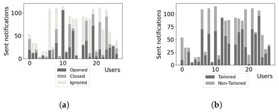 Notification action and tailored/non-tailored notification distribution. (a) denotes the distribution of reactions to notifications delivered, (b) denotes the proportion of TN delivered to users.