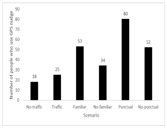 Finally, to evaluate whether there are external conditions (kind of scenario) that elicited the use of GPS (H4), we performed a Cochran Q test. We classified 1 when a person uses the GPS nudge, and 0 when a person does not use GPS. The analysis revealed a significant difference among the 6 scenarios (Q5 = 112.05, p < 0.001). The pairwise comparisons showed that the no-traffic scenario differed by the familiar-path (p < 0.001), non-familiar-path (p < 0.05), punctual (p < 0.001), and non-punctual (p < 0.001) scenarios; the non-traffic scenario differed by the non-familiar-path (p < 0.05), punctual (p < 0.001), and non-punctual (p < 0.001) scenarios; the non-familiar-path scenario differed by the familiar-path (p < 0.01), punctual (p < 0.001), and non-punctual (p < 0.001) scenarios; and the punctual scenario differed by the non-punctual (p < 0.001) scenario. See the descriptive in Figure 1.
