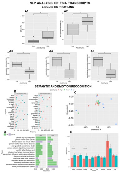 Verbal analysis of Toronto Structured Interview for Alexithymia (TSIA) transcripts. In the Natural Language Processing (NLP), the Linguistic Profiling Analysis showed High Alexithymia subjects produced more pseudowords or non-words (tag: Other) (A1), used the present tense of auxiliary verbs more (A2), used the possessive determiners less (A3), used fewer coordinating conjunctions (A4), and less coordinating conjunction relation (A5), when compared to Low Alexithymia subjects. In the boxplot are reported the percentages of frequency (median ± percentile). ** P adjusted = 0.01; * at least P adjusted = 0.03. Semantic analysis showed that High Alexithymia subjects used less emotional keywords (feel, happy, to express) and more filler words (maybe, in conclusion, huh) (B). This pattern of differential use of words is confirmed by unsupervised Latent Semantic Analysis (LSA), showing cluster separation between High, Medium (participants with middle alexithymia levels), and Low Alexithymia subjects on a two-dimensional space representing the latent semantic structure. The orthogonal dimensions represent semantically related cluster of words, and Low and High Alexithymia subjects are divided by Dimension 4 and 5 in the LSA space (C). Unsupervised Latent Dirichlet Allocation (LDA) identified 20 topics, described by the top five words for frequency of use. Three topics were significantly different between High and Low Alexithymia subjects (P ≤ 0.05; Topic 1: fashion, reason, end, minute, effect; Topic 2: day, home, week, sister, vacation; Topic 3: sense, parent, news, scene, patient) (D). Exploring sentiment polarization, High Alexithymia subjects were characterized by a reduced frequency of emotion-related words, when compared to Low Alexithymia subjects, specifically for anger and disgust (* at least P = 0.025) (E). In the histograms are reported the frequency mean (mean ± standard deviation).