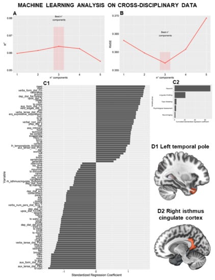 Machine Learning Analysis on Cross-Disciplinary Data. Natural Language Processing (NLP) data were aggregated with demographic, neuroimaging, and psychological data to predict Toronto Structured Interview for Alexithymia (TSIA) scores. Candidate features (n = 92) were extracted using univariate filtering with Spearman correlation method, Principal Components Regression (PCR) model with three components was selected as it had the best performance over evaluation metrics assessed in Leave-One-Out Cross-Validation (LOOCV) (R2 = 0.86; Root Mean Square Error—RMSE = 0.35) (A,B). Variable importance is reported (C1,C2). Namely, 85 candidate features resulted to belong to NLP, 3 to psychological measures, 2 to neuroimaging data, and 2 to demographic data. The variable importance of neuroimaging data showed that the increased left temporal pole thickness (orange colored area, D1) predicted increased TSIA scores, while increased right isthmus cingulate thickness (orange colored area, D2) predicted decreased TSIA scores. In (D1,D2) left is left.