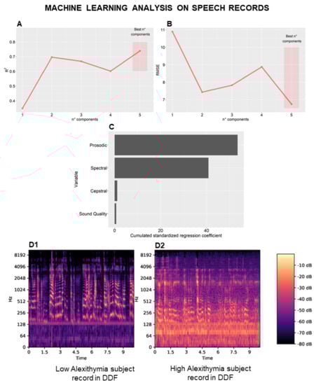 Machine Learning Analysis on Speech Records. Univariate correlation filtering was applied to select 212 candidate acoustic features belonging to the ComParE feature set and Principal Components Regression (PCR) model with 5 components was selected as the best fitting based on R2 and Root Mean Square Error (RMSE) metrics in Leave-One-Out Cross-Validation (LOOCV) (R2 = 0.74; RMSE = 6.74) (A,B). Relative variable importance was computed over the domains of ComParE low-level descriptors, namely sound quality, spectral, cepstral, and prosodic (C). Representative differences in audio tracks (recorded in responding to an item of Difficulty in Describing Feelings—DDF) from High Alexithymia subjects and Low Alexithymia subjects can be observed in spectrograms (D1,D2).