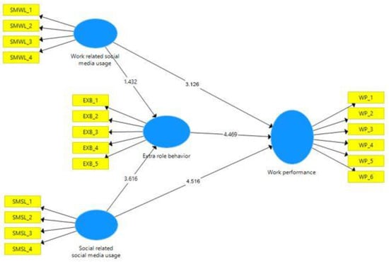 For testing the hypothesized relationship, path coefficient values and their significance are evaluated. According to Hair (2019), standard bootstrapping of 5000 samples was considered for evaluation [63]. Both t and p values were considered to determine the significance of the path coefficient of the model. The t values greater than 1.96 are considered significant for the study [71,72]. The path coefficient value of the relationship between work-related social media usage (WRSMU)→work performance (WP) is 0.223. The t statistics and p-value of the relationship WRSMU→WP are also significant at 3.126 (t > 1.96). Path coefficient values of the relationship between social-related social media usage (SRSMU)→work performance (WP) is 0.312. The t statistics and p-value of the relationship SRSMU→WP are also significant at 4.516 (t > 1.96). Table 5 represents the significance of the path coefficient.
