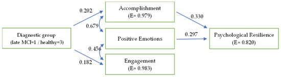 With regard to the first path model confirmed, it has a good fit to the data, χ2 (7) = 7.138, p > 0.05, CFI = 0.999, SRMR = 0.050, and RMSEA = 0.019 (90% CI: 0.000–0.163). According to the path analysis model (Figure 1), healthy people have higher levels of engagement and accomplishment—the last of which is associated to higher psychological resilience—than people with advanced MCI. Nevertheless, positive emotions are positively related to engagement and accomplishment, and they appear to “lead” to psychological resilience directly and indirectly based on accomplishment, independently of the group type.
