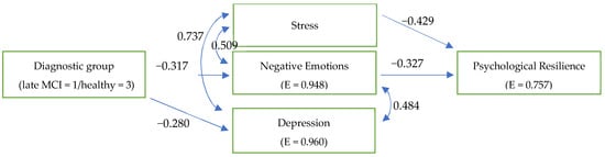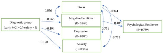 On the same diagnostic groups, the confirmed model for the directional relationships between resilience and negative affect also fits well to the data (Figure 2). The S–B χ2 (3) = 5.7732, p > 0.05, was not significant, CFI = 0.969. However, at this point, it must be noted that RMSEA = 0.130 (90% CI: 0.000–0.286). As the model shows, healthy participants display fewer negative emotions and lower depression symptomatology, as compared to late-stage MCI patients. Moreover, negative emotions are associated with a lower level of resilience. This means that late-stage MCI patients display a lower level of resilience, compared to healthy controls, via this indirect relationship between the group and resilience. Depression is not directly associated with resilience, but only via its positive relationships with both negative emotions and stress. Stress, on the other hand, seems to not be affected by the diagnostic group, but it has a clear negative association with resilience, which seems to be the case for both groups.