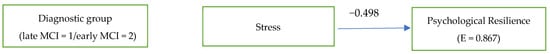 The only path model which was confirmed for the two MCI diagnostic groups (Figure 3), S–B χ2 (8) = 6.0012, p > 0.05, CFI = 1.000, RMSEA = 0.000 (90% CI: 0.000–0.133), underscores that both MCI groups encounter stress that is significantly and negatively associated with their psychological resilience and partially supports the first hypothesis (H1).