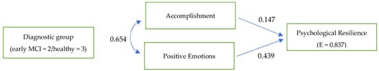 Another path model was confirmed for the healthy controls and the early MCI participants (Figure 4). The indices are good, χ2 (9) = 9.183, p > 0.05, CFI = 0.999, SRMR = 0.062, RMSEA = 0.018 (90% CI: 0.000–0.146). This path supports the second hypothesis (H2) and highlights that both older adults with early MCI as well as healthy individuals experience positive emotions and feelings of accomplishment that can contribute to the enhancement of their resilience levels.