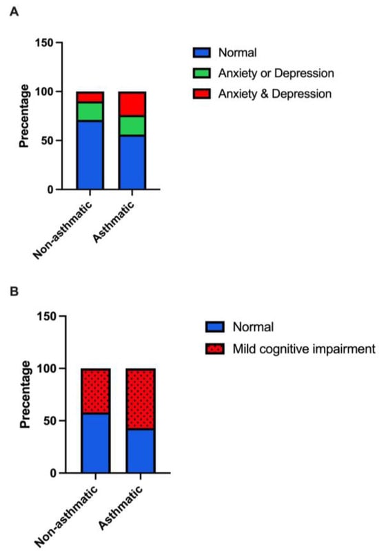 The prevalence of (A) anxiety and/or depression, and (B) mild cognitive impairment among asthmatic compared to non-asthmatic individuals.