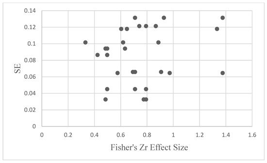 A random effects model was adopted, and the results were as follows for each EF model: For shifting, the mean effect size was 0.85, z = 16.76, p < 0.001. In shifting, the total amount of variance explained in the factor by the tasks was 0.72. For inhibition, the mean effect size was 0.55, z = 14.72, p < 0.001. The total amount of variance explained in inhibition by the inhibition tasks was 0.30. In updating, the mean effect size was 0.80, z = 9.66, p < 0.001. The amount of variance explained in the updating factor by the updating tasks was 0.64. See Table 1 for complete results and descriptive statistics. To determine the existence of publication bias, a funnel plot was created using the variation of effect size as a function of standard error. See Figure 2 for the funnel plot.