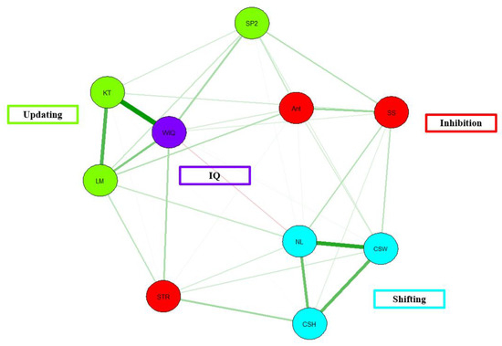 Similar to their earlier study, a network model of Friedman et al.’s [18] data shows similar patterns of edge connections among and between the EF nodes (see Figure 6). However, it is important to note that the inhibition tasks are not strongly converging with one another, showing a lack of construct validity for this EF construct.