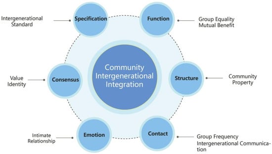 Furthermore, intergenerational integration theory holds that behavior is a key component in the promotion of intergenerational integration. In addition, intergenerational integration behavior is closely related to the attributes of function, emotion, connection, norms, and organization, all of which are part of intergenerational integration theory [40]. Figure 1 outlines our definition of an intergenerational model based on intergenerational theory in a community context.