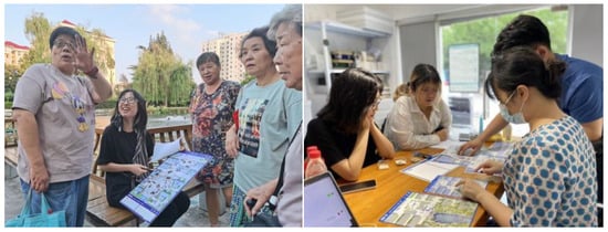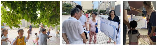 In this way, the needs that had been identified and the solutions that had emerged from public co-creation were improved and clarified through iteration. In addition to the rational organization of the research team, community leaders also played an important role, as they “built bridges” between the team and the community and gathered their friends and family to complete the iterative process while offering valuable suggestions themselves. In addition, as older people were relatively less involved than other groups, the team sent young college students to the places where older people gathered in the community to conduct “one-on-one” inquiries and elaborate on the original proposal, to ensure that the older people effectively understood the purpose of the activity. As a result, even older people who were initially reluctant to express their opinions gradually became willing to express themselves and invited other older people to join in the discussion. See Figure 5.