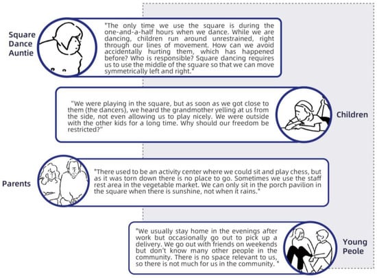 During the participatory research process, the residents articulated many real self-needs through the interactive methods, i.e., games and question answering. Analysis of these needs revealed that the conflict between the groups was mainly due to their belief that the square was for public use and thus they had the right to use it. Through community participatory research, we learned that residents of all ages have many needs for public spaces, such as recreation, socialization, and rest. Regarding intergenerational relationships, the research results revealed that conflicts between children and older groups are more prominent, mainly focusing on square activities. To further understand the specific reasons for the conflicts, we conducted user interviews with community residents of all ages after the participatory research, combined with research information from community residents. The research showed that, although there was nothing wrong with this starting point for each group, the lack of empathy the groups showed for each other—as demonstrated by various reasons group members gave for opposing others’ interests—made the conflict serious. Figure 3 shows excerpts of the views of some residents.