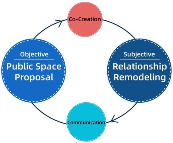 Furthermore, community building is regarded as a dynamic process whereby residents in a certain geographical area establish strong social ties through interaction and communication. The core of community creation is public participation, which emphasizes public spontaneity, and community creation can be used as a concept and methodology to guide community residents to participate in community building and management on their own [28,29]. The community creation context also allows groups to improve their community environment by discussing and dealing with community issues together, thereby enhancing residents’ sense of community identity, promoting strong social ties between residents, and increasing community-to-community ties to form a large community and promote healthy and sustainable social development [30]. That is, residents collaborate to discuss community issues and solve community problems by combining their collective wisdom to contribute to the sustainable development of the community.