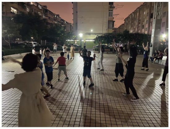 The research team followed a co-creation theoretical approach from the initial immersion research to the subsequent implementation of the residents’ co-creation design activities. The project lasted nearly 2 months, and through the efforts of the team and their helpers, the relationships between the residents underwent a subtle change. To verify the concrete effect of the design intervention, we conducted regular participatory observations in the community square during the project’s process [52]. At the beginning of the project’s intervention, there were many incidents of conflict. We helped to coordinate and understood the causes of the conflict and invited the residents involved in the conflict to join our design process. As the project continued, intergenerational relationships improved through collaboration and co-creation as residents developed empathy and an understanding of each other. Therefore, in the later stages of the project, our observations found that the number of angry interactions in the square between residents decreased, and children could even be seen dancing with older people (see Figure 7), indicating that the application of co-creation theory during the design process improved the relationships between residents. After the project ended, the research team continued to follow the dynamics of the community, and the number of conflicts did not rebound.