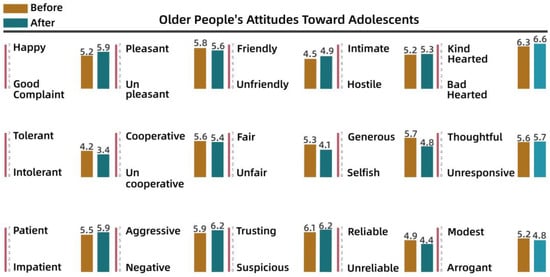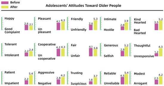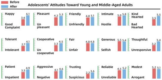 It is clear from Figure 8 and Figure 9 that the children’s attitudes toward both adult groups changed after the intervention, and that this change was generally in a positive direction. However, the change in children’s impressions of young and middle-aged adults was small, ranging from 0.2 to 2 percentage points for each variable, while the change in their impressions of older people was larger, especially for “friendly–unfriendly”, “patient–impatient”, and “generous–selfish”, which improved by 2 to 3 percentage points. This also indicates that the children’s stereotypes of other groups had gradually changed through participation in dynamic activities over time.