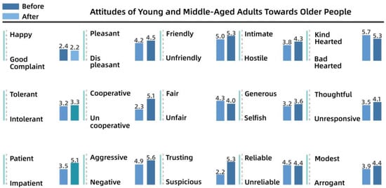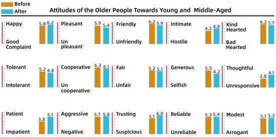 Figure 10 shows that there was little change in the attitudes of young and middle-aged adults toward children after the intervention, although they were generally more positive, with higher weights for “happy”, “negative”, “generous”, and “trusting”. As shown in Figure 11, before the intervention, young and middle-aged adults perceived the older group as more “complaining”, “uncooperative”, and “intolerant”, whereas after the intervention, they perceived the older group as more “cooperative” and “trusting”. After the intervention, apart from the substantial increase in “cooperative” and “trusting”, other variables increased by only a small magnitude. The team determined that this lack of a significant effect after the intervention indicated that the cognitive system of the young and middle-aged adults was relatively stable.