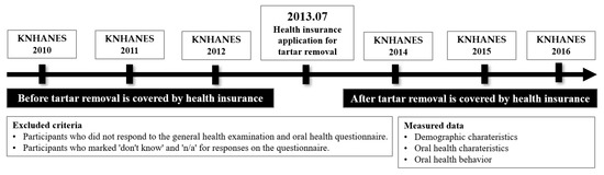 Data were collected from health insurance subscribers in Korea and analyzed, except for data from 2013, when tartar removal was covered by health insurance. Therefore, the year before tartar removal is covered by health insurance is from 2010 to 2012, and the year after tartar removal is covered by health insurance is from 2014 to 2016. KNHANES is a survey to produce government-designated statistics (Approval No. 117002) based on Article 17 of the Statistics Act. For the 5th round, the 1st year was 2010-02CON-21-C, the 2nd year was 2011-02CON-06-C, and the 3rd year was 2012-01EXP-01-2C. For the 6th round, the 2nd year was 2013-12EXP-03-5C. After the 3rd year, it fell under the study that is directly conducted by the government for the public welfare.