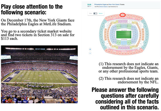 A total of 640 participants were recruited via Qualtrics, a consumer insight panel, to complete an online survey. Participants were solicited electronically via 10 date-specific email blasts and recruited prior to a New York Giants home game on Sunday Night 17 December 2017. Participants were asked to complete two screening questions to verify that they met eligibility criteria (i.e., New York- and Philadelphia-area fans). Participants who agreed to take part in the study were next randomly assigned to a vignette ticket purchase scenario. The main study used a 2 (demand: high vs. low) × 2 (numeracy framing: frequency vs. percentage) factorial between-group design; participants were randomly assigned into five groups, including a control-group scenario. The hypothetical scenario controlled extraneous factors of seat location, time, and event date (see Figure 3). According to the scenario, participants were instructed to buy two tickets prior to the event. They were asked a pair of questions that estimated the likelihood of future events (i.e., anticipated ticket availability and the expected likelihood of finding a lower-priced deal later). These questions were followed by several demographic items addressing participants’ attitudes and behavior, including their ticket purchase experience, knowledge, and fan involvement.
