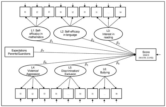 This is a quantitative, non-experimental, correlational, and cross-sectional study [83]. A latent regression analysis [84] was carried out considering covariates, where the endogenous variables were the SIMCE Mathematics and Language test scores, with seven variables exogenous. Six latent variables comprised 24 items measured with an ordinal scale of four categories (1 = Never/Very untrue, 2 = Few times/Untrue, 3 = Many times/True, 4 = Always/Very true). They were distributed as follows: L1: Interest in reading, made up of four items; L2: Bullying, made up of eight items; L3: Self-efficacy in mathematics, made up of three items; L4: Self-efficacy in reading, made up of three items; L5: Violence perceived by parents, made up of four items; L6: School discrimination perceived by teachers, made up of four items; and standardized parental educational expectations, corresponding to the perception of the highest level of education that the student would be able to complete in the future, and the covariates included were gender and type of school. SEMs (Structural Equation Model) with latent variables allow us to specify regression analyses at the level of latent variables (factors) that are corrected for measurement error. This procedure has the advantage that error of measurement can be taken into account explicitly for both the independent and the dependent variable(s). Furthermore, SEMs with latent variables allow us to estimate the reliabilities of the manifest variables. The explicit consideration of measurement error leads to a more precise estimation of the parameters of the regression model compared to manifest regression analyses with observed variables that are not adjusted for measurement error. Multiple indicators are required for each latent variable in a latent regression model (LRM) [84].