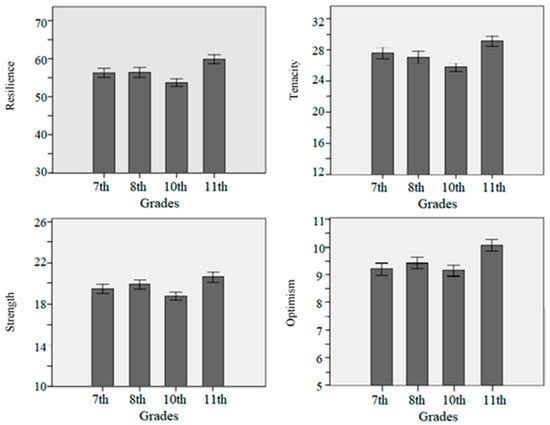The tenacity score significantly differed across grades, F(3,555) = 4.00, p = 0.008 < 0.01, η2p = 0.021; the tenacity score in 10th grade (M = 25.79, SD = 6.42) was significantly lower than in 11th grade (M = 29.15, SD = 7.47). The strength score significantly differed across grades, F(3,555) = 3.18, p = 0.024 < 0.05, η2p = 0.017; the strength score in 10th grade (M = 18.76, SD = 4.33) was significantly lower than in 11th grade (M = 20.64, SD = 4.97). The optimism score significantly differed across grades, F(3,555) = 3.68, p = 0.012 < 0.05, η2p = 0.020; the optimism score in 7th grade (M = 9.20, SD = 2.82) was significantly lower than in 11th grade (M = 10.08, SD = 2.37). The optimism score in 10th grade (M = 9.15, SD = 2.24) was also significantly lower than in 11th grade (M = 10.08, SD = 2.37) (see Table 2).