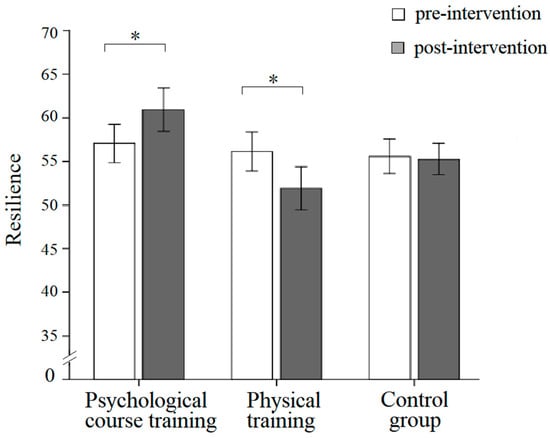 The resilience differences between pre-intervention and post-intervention of three groups in the 7th grade. Note. Error bars indicate standard errors. * p > 0.05.