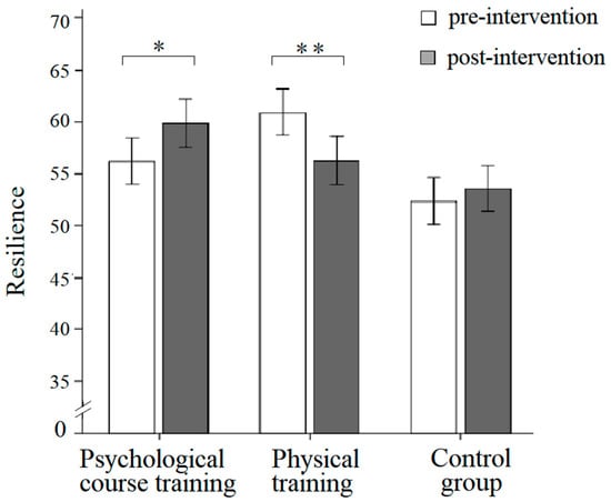 The resilience differences between pre-intervention and post-intervention of three groups in the 8th grade. Note. Error bars indicate standard errors. * p > 0.05. ** p > 0.01.