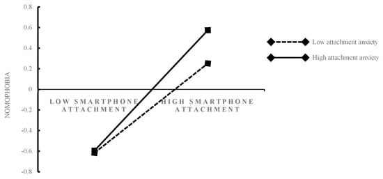 Although smartphone attachment can significantly affect nomophobia, we found that levels of attachment anxiety have a moderating effect on the relationship between smartphone attachment and nomophobia. For individuals with high levels of attachment anxiety, smartphone attachment significantly predicts nomophobia, whereas smartphone attachment has no significant predictive effect for those with low levels of attachment anxiety. As such, our second hypothesis was supported.