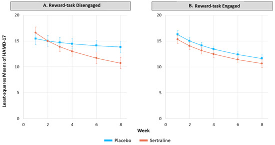 Effect of sertraline treatment on symptom severity among reward task disengaged (A) and reward task engaged (B) participants with major depressive disorder. Note: Shown with standard error bars; 17-item clinician-rated Hamilton Depression Rating Scale scores (HAMD-17); F(1293) = 4.33, p = 0.038.