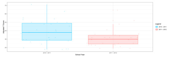Box plot of adjusted T-scores across school years.