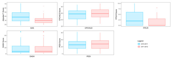 Because the goals of each child may be unique and the number of goals across children can vary, a statistical analysis of GAS scores is challenging and thus there was no statistical test performed to determine whether a significant difference occurred between school years. In this regard, Figure 2 displays the range of scores for GAS and the traditional assessments CPCHILD, FPS-R, DASH, and PEDI for years 2010–2011 and 2011–2012. A noticeable visual difference occurs both in the range and quantiles of scores within the GAS between the school years, as the scores decreased between years. Of the traditional assessments, only the FPS-R assessment depicts a difference in the scores between the two years; however, the scale to which these ranges of scores differ is far less than that of the GAS scores. The CPCHILD, DASH, and PEDI scales display very little difference between the range of scores from one year to the next.