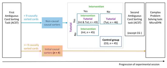The experimental procedure for each respective experimental group was as follows (see Figure 1): all participants started with the initial ACST. The participants who sorted nine or more cards using a causal strategy were classified as initial causal sorters and assigned to a separate group, i.e., initial causal sorters (ICS). They did not undergo any further experimental interventions and continued directly with the complex problem-solving task. In the intervention group (Int), the participants proceeded with the intervention, followed by the second ACST and the complex problem-solving task. The group that received the intervention and tutorial (Int and Tut) proceeded with the intervention, followed by the tutorial, second ACST, and the complex problem-solving task. The tutorial-only group (Tut) progressed with the tutorial, and then performed the second ACST and finished with the complex problem-solving task. The control group (CG) continued with the complex problem-solving task immediately after the first ACST. We did not include a second ACST in the control group in order to minimize the impact that the ACST itself may have on the construal of schema-governed categories [55]. The order of the versions (ACST and ACST_p) was balanced between the participants within each experimental group.
