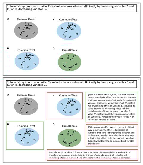 Using these insights helps identify targets for the design of effective learning tasks, which is one of the central goals of this study. Earlier accounts have demonstrated that the ability to categorize situations according to their underlying principle or causal relationship can be trained and is associated with better problem-solving performance, e.g., for statistical problems [58] and for physics problems [59,60]. Goldwater and Gentner [25] investigated learning tasks that promote an expert-like ability to organize situation descriptions according to their underlying causal structure. In their study, they concentrated on four very basic, but ubiquitous key causal models: common cause, common effect, causal chain, and positive feedback system. They found the combination of direct explication of the key causal models followed by a guided structural alignment task to be most effective in increasing the ability to recognize key causal models across different situation descriptions in the Ambiguous Card Sorting Task (ACST) [26]. The authors attributed this expert-like relational shift to the fact that participants learned to use the schema-governed categories of the key causal models to make sense of novel situations.